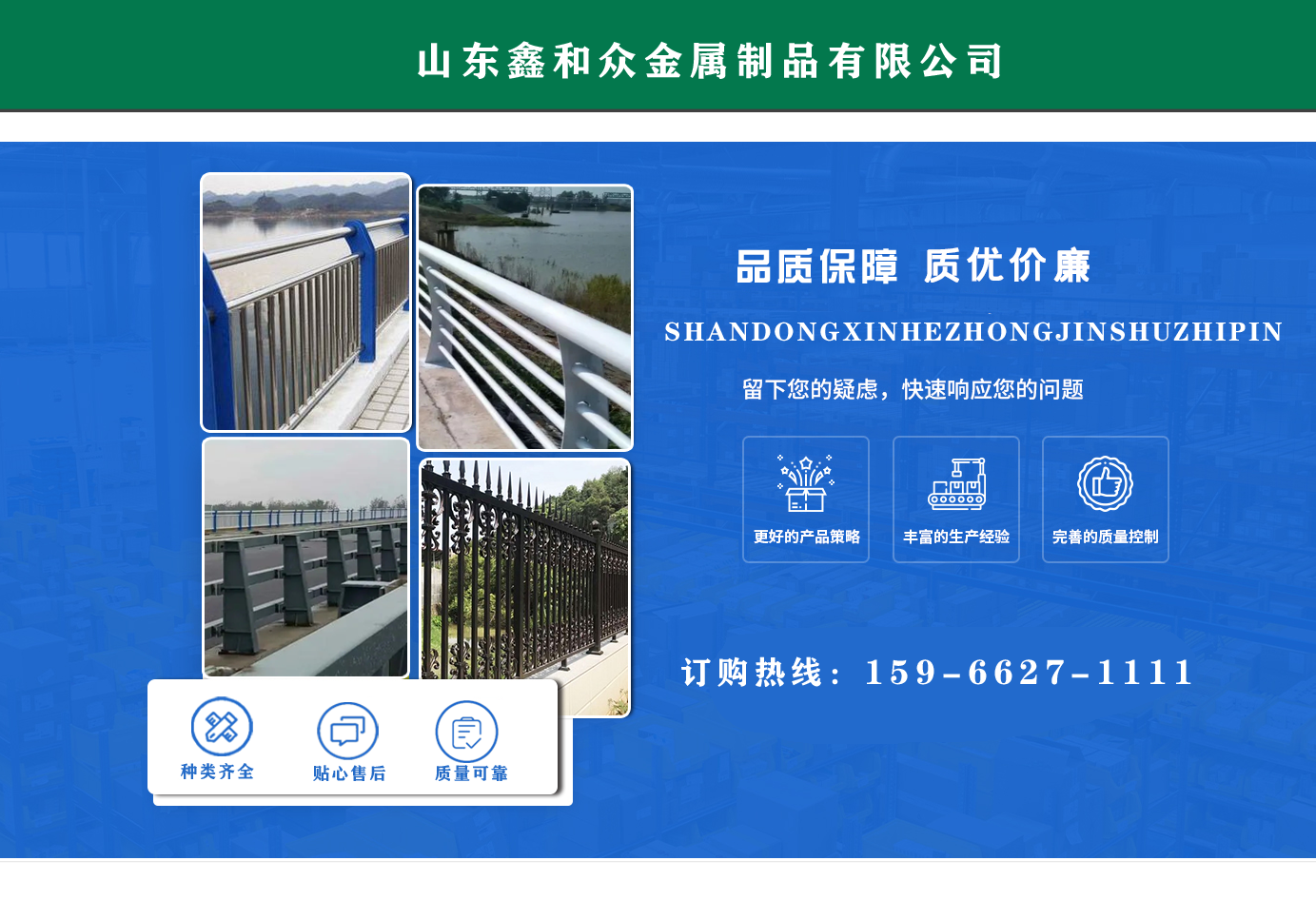 山東鑫和眾金屬制品有限公司主要產(chǎn)品有防撞護(hù)欄,橋梁護(hù)欄,道路護(hù)欄,河道護(hù)欄,不銹鋼護(hù)欄等護(hù)欄。提供設(shè)計(jì)方案,一站式定制,包您滿(mǎn)意價(jià)格優(yōu)惠,歡迎來(lái)電咨詢(xún)!    公司常年從事銷(xiāo)售護(hù)欄防撞護(hù)欄,橋梁護(hù)欄,道路護(hù)欄,河道護(hù)欄,不銹鋼護(hù)欄,橋梁鋼護(hù)欄,河道燈光護(hù)欄等。產(chǎn)品廣泛應(yīng)用于橋梁、河道、旅游景區(qū)、道路、公路、公園、小區(qū)、景觀、道路防撞等領(lǐng)域?!   」井a(chǎn)品均采用優(yōu)質(zhì)不銹鋼材料,符合相關(guān)標(biāo)準(zhǔn)。各種型號(hào)不銹鋼復(fù)合管及護(hù)欄,質(zhì)量嚴(yán)格把控。產(chǎn)品強(qiáng)度高、耐腐蝕、焊接牢固、抗沖擊、性能好,防撞護(hù)欄結(jié)構(gòu)簡(jiǎn)單、美觀實(shí)用大方。     歡迎前來(lái)訂購(gòu)!...